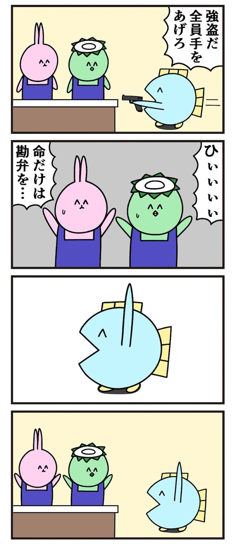 「全員手をあげろ!」と銃を突き付けられ、言われた通りに命乞いするウサギさん達でしたが……。