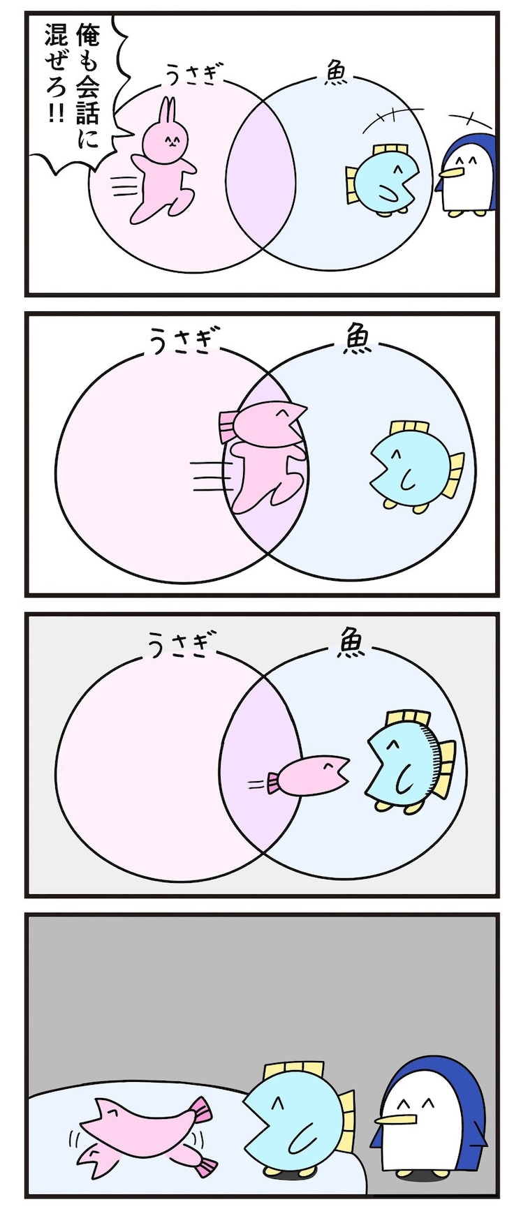 ペンギンさんと魚さんの会話に、どうしても混ざりたかったウサギさん。