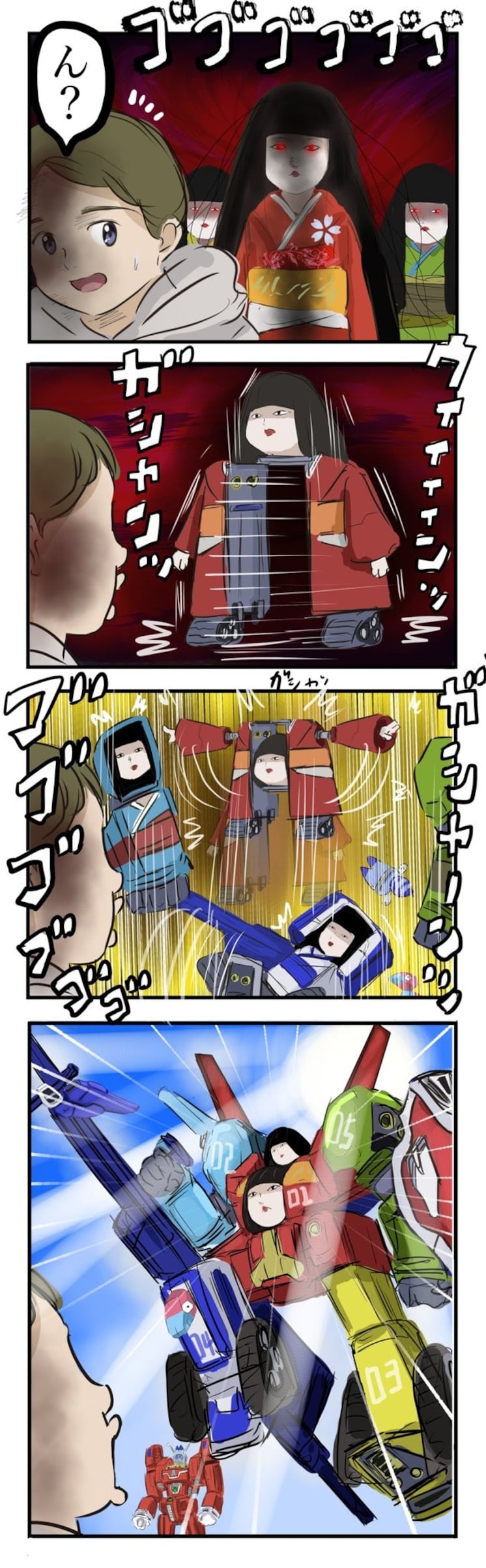 しかし、日本人形は行ったのは、呪いではなく、ロボットアニメのような合体・変身だったのでした!