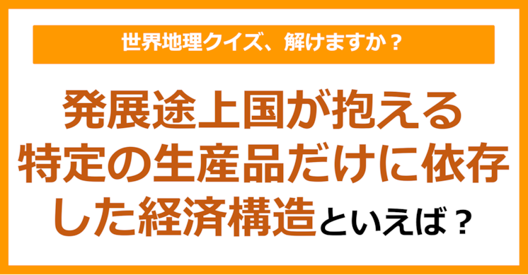 【世界地理】発展途上国が抱える特定の生産品だけに依存した経済構造といえば?(第413問) その他 citrus 編集部 2025.10.24 SNSで盛り上がった選りすぐりのネタを紹介するcitrus。 今回は話題の情報から少し離れてひと休み。頭の体操でリフレッシュしましょう! 出題するのは世界地理に関するクイズです。 答えはこちら >