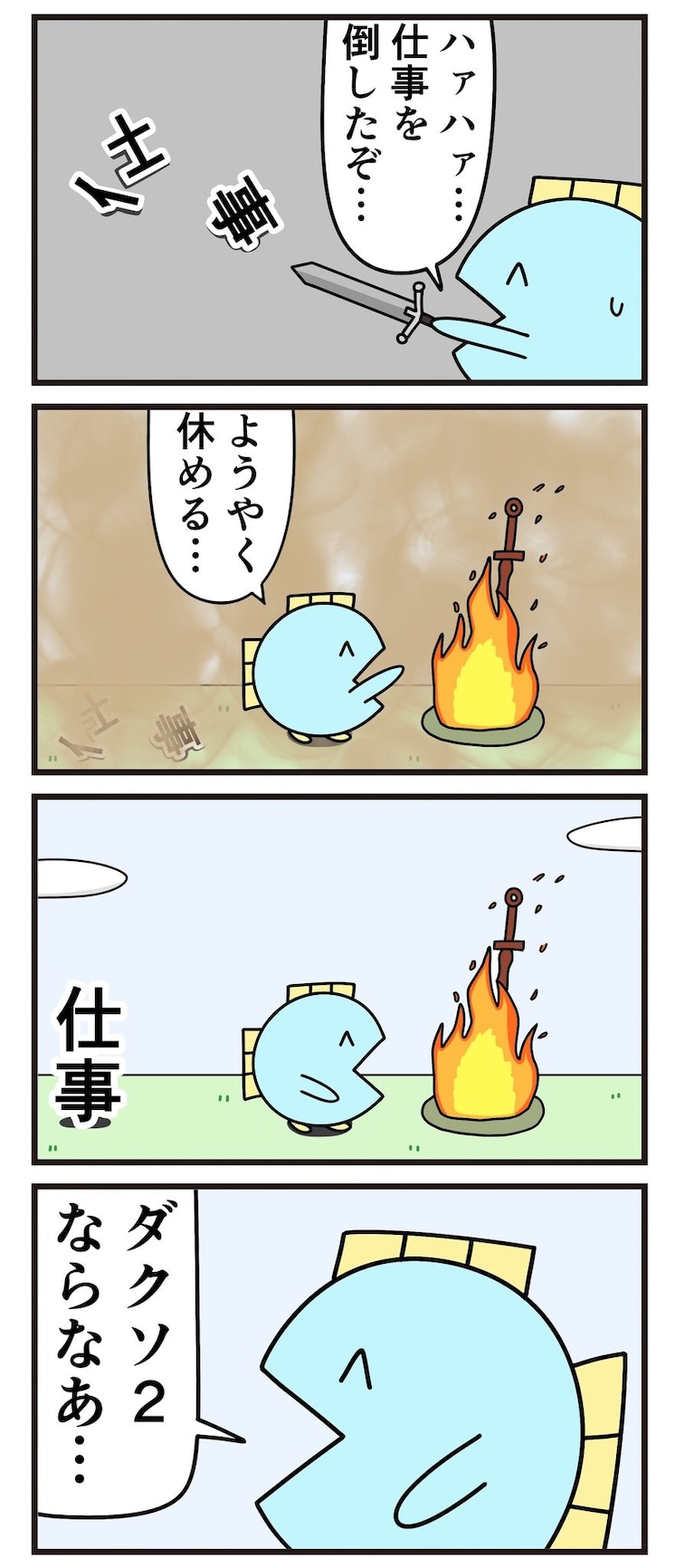 ゲーム『ソウルシリーズ』の世界の中で、『仕事』という敵を倒した魚さん。