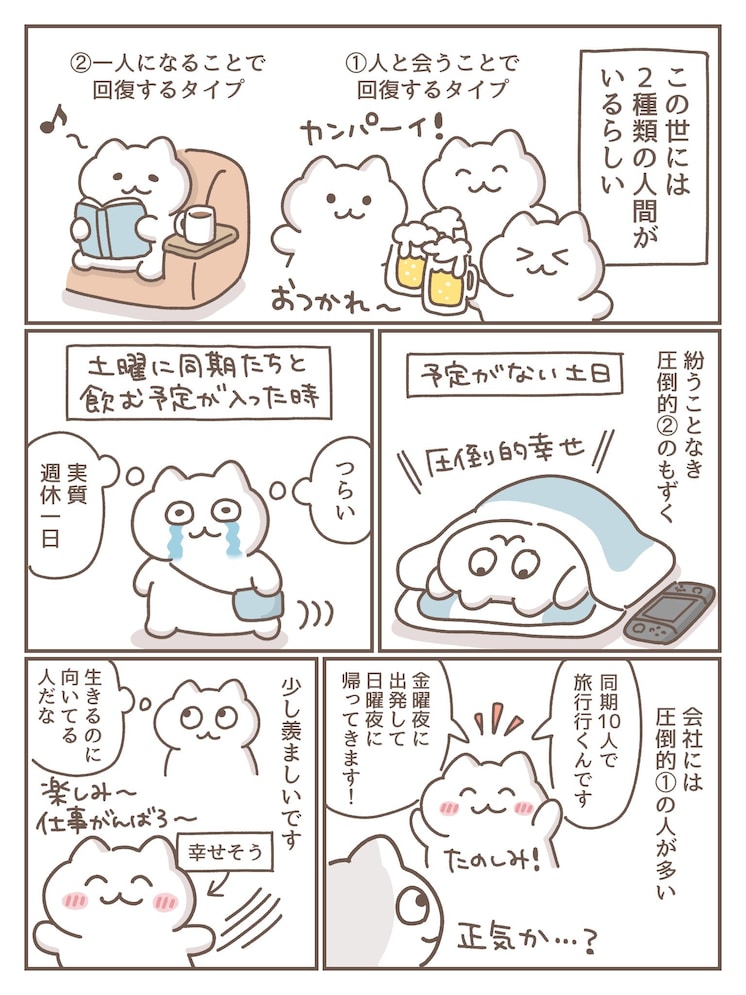 ひとつは人と会うことで疲れを癒す外向的な人間。もうひとつはひとりの時間を必要とする内向的な人間です。